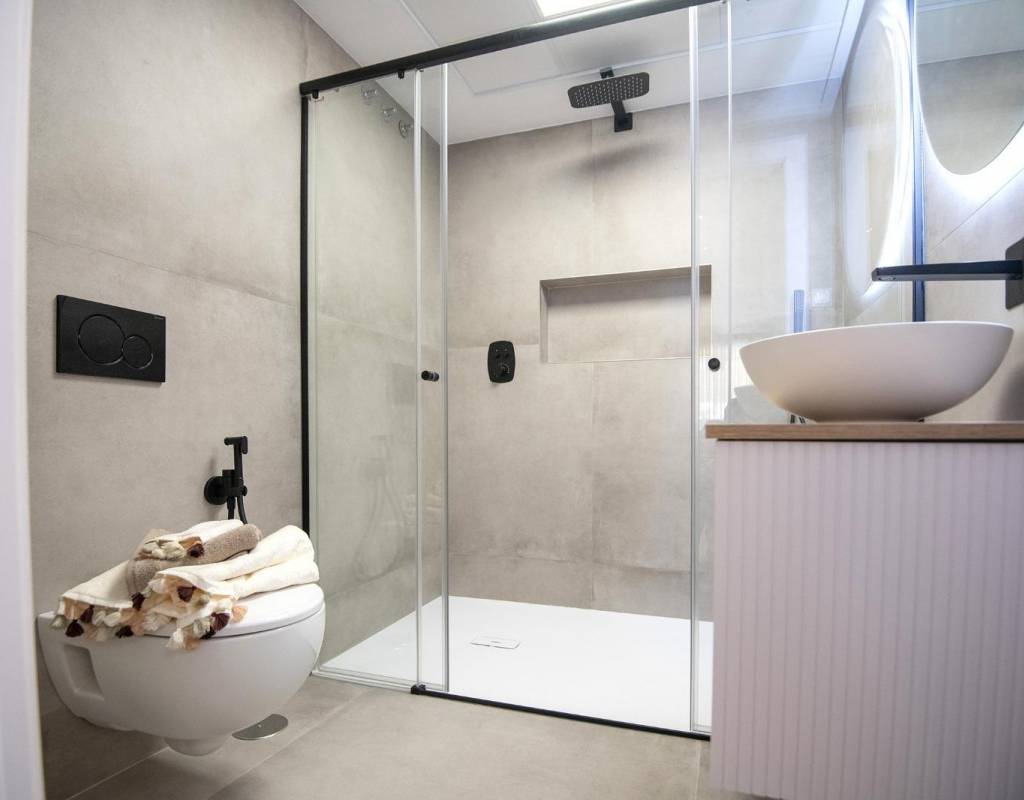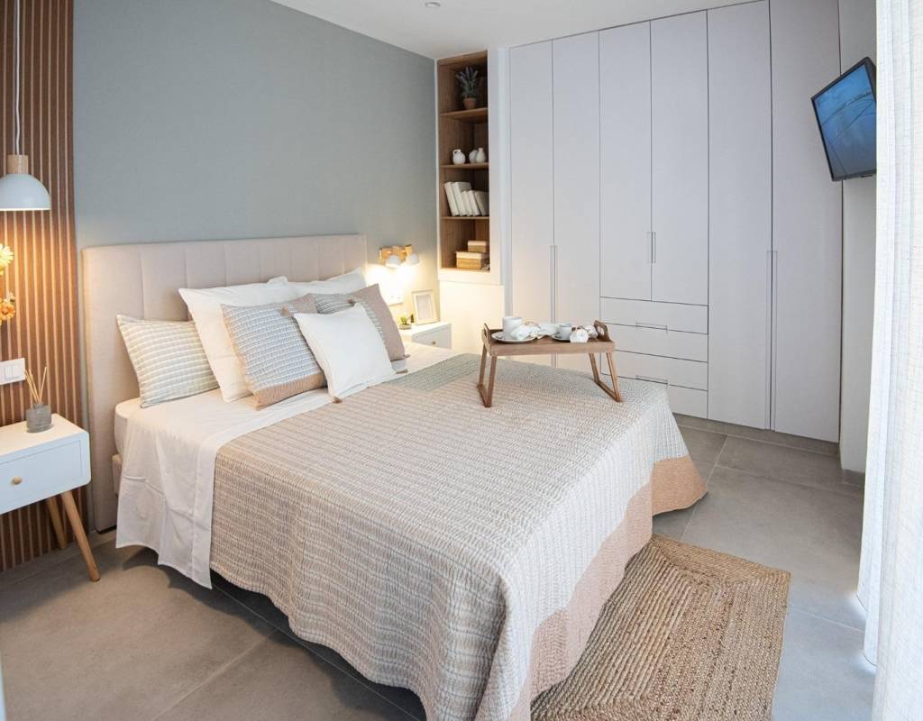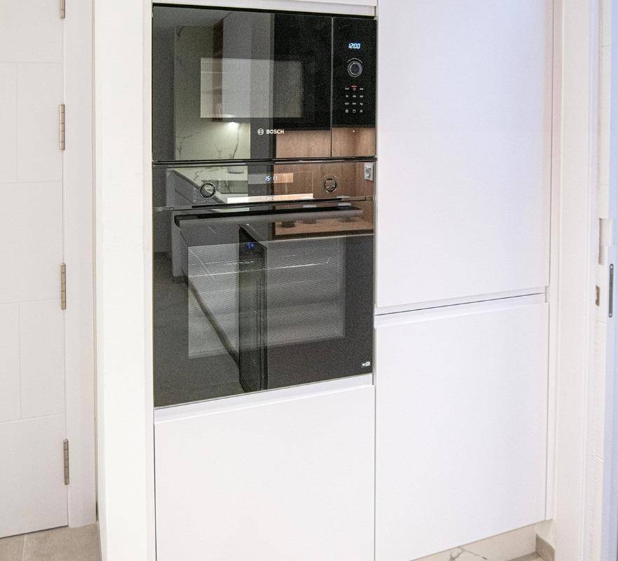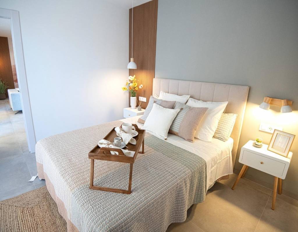 Apartments and penthouses with 2 and 3 bedrooms, 2 bathrooms, with open plan fully equipped kitchen with white goods - Bosch or Siemens, living area, large terraces, fitted wardrobes, fully equipped bathrooms with underfloor heating, aircon, electric shutters, closed storage, parking space with socket 16 Amp for electric cars.