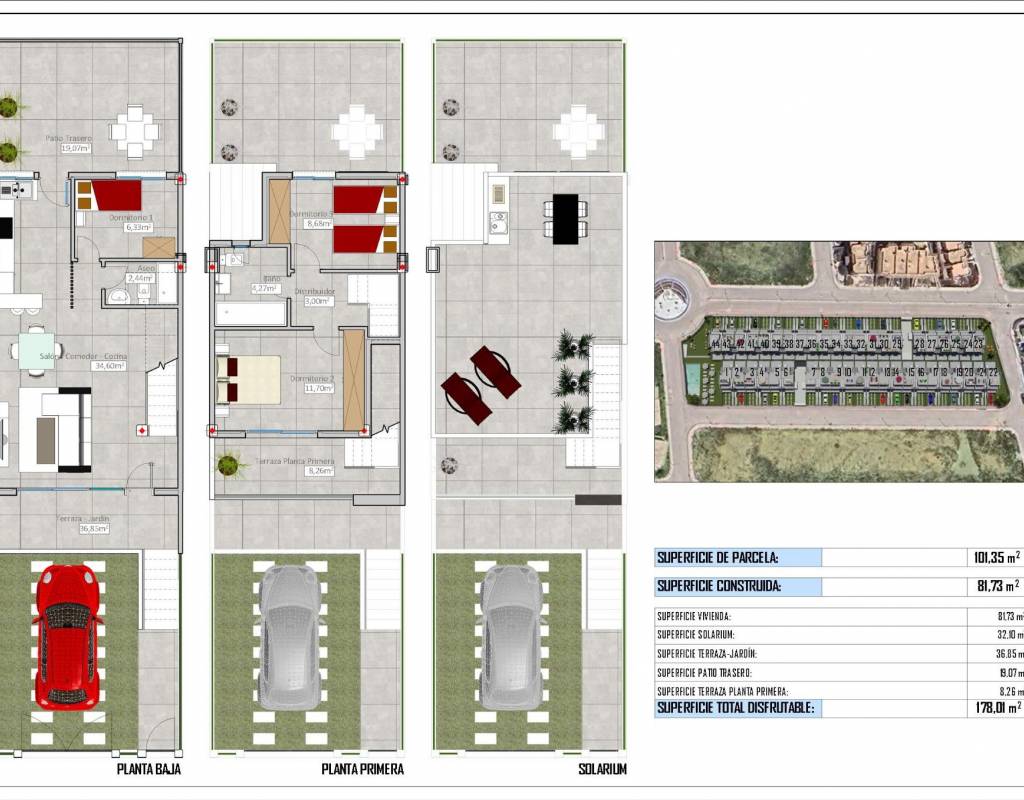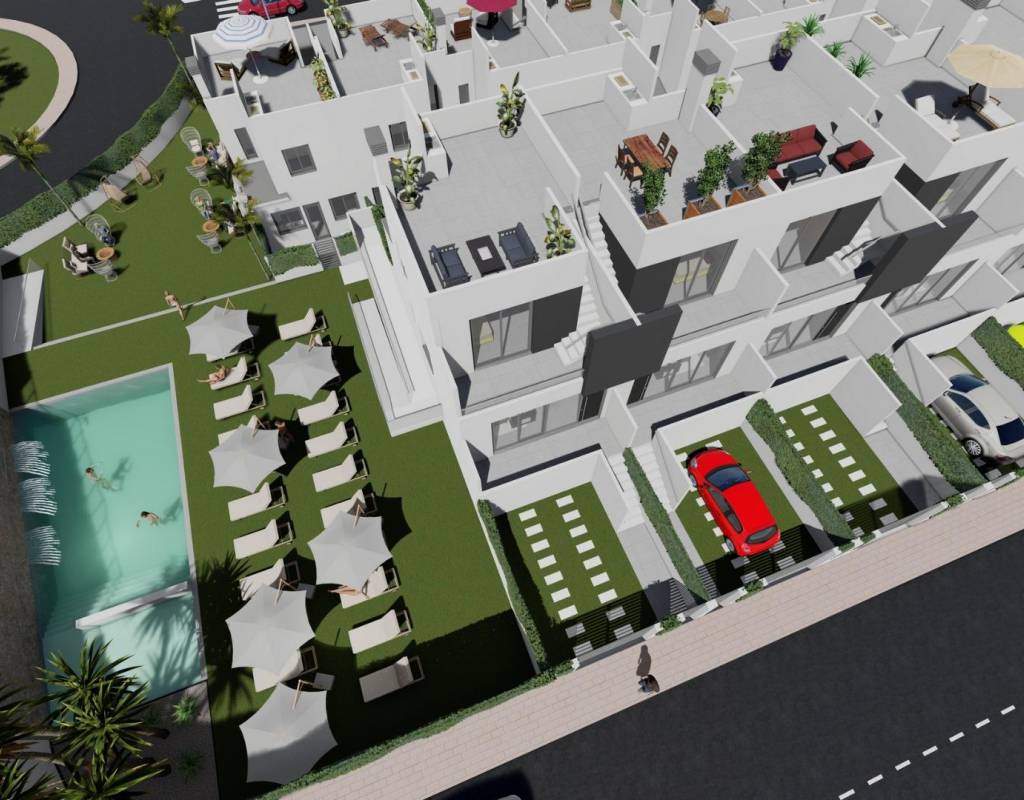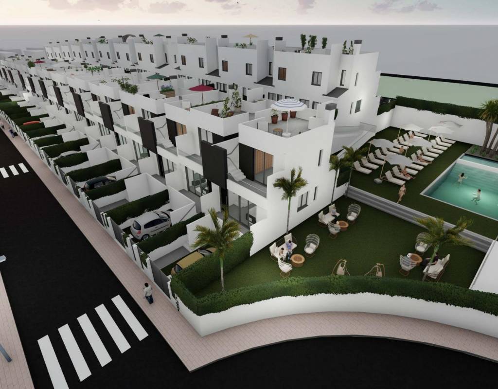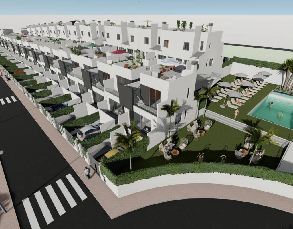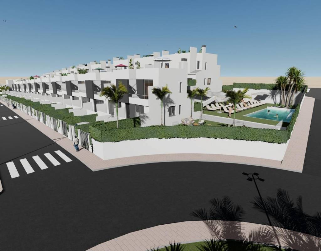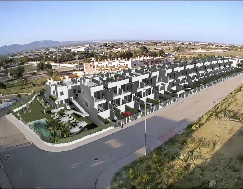 Discover a new residential development of 44 modern townhouses in Cox, Alicante. These homes are available in 2- and 3-bedroom layouts, each featuring a private solarium, terraces, patios, and private parking. The community offers access to shared areas, including a communal swimming pool, creating an ideal environment for relaxation.