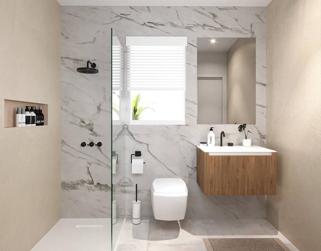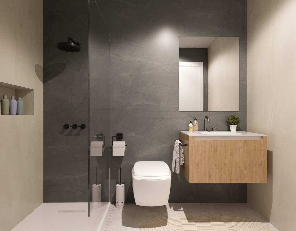Fully equipped bathrooms, including built-in niches in showers, mirrors with lighting, and vanity units.