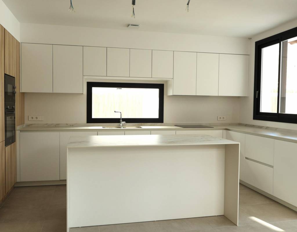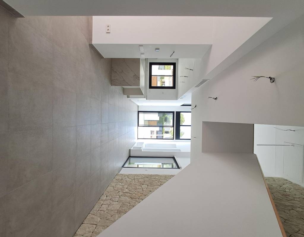 The villas offer four generous bedrooms, three bathrooms, and a guest toilet distributed across two floors. The open-plan living and dining area features double-height ceilings that enhance natural light and create an airy, inviting atmosphere. Additional highlights include an interior garden with a skylight, a wine cellar, and a floating staircase that adds a touch of architectural elegance. Kitchens come fully furnished with upper and lower cabinets and high-quality appliances, while electric roller blinds in the bedrooms provide both comfort and convenience.