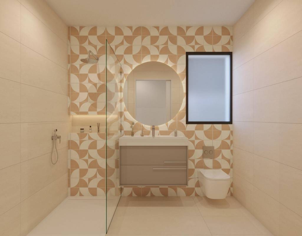 Bathrooms with furniture, mirrors, and shower screens