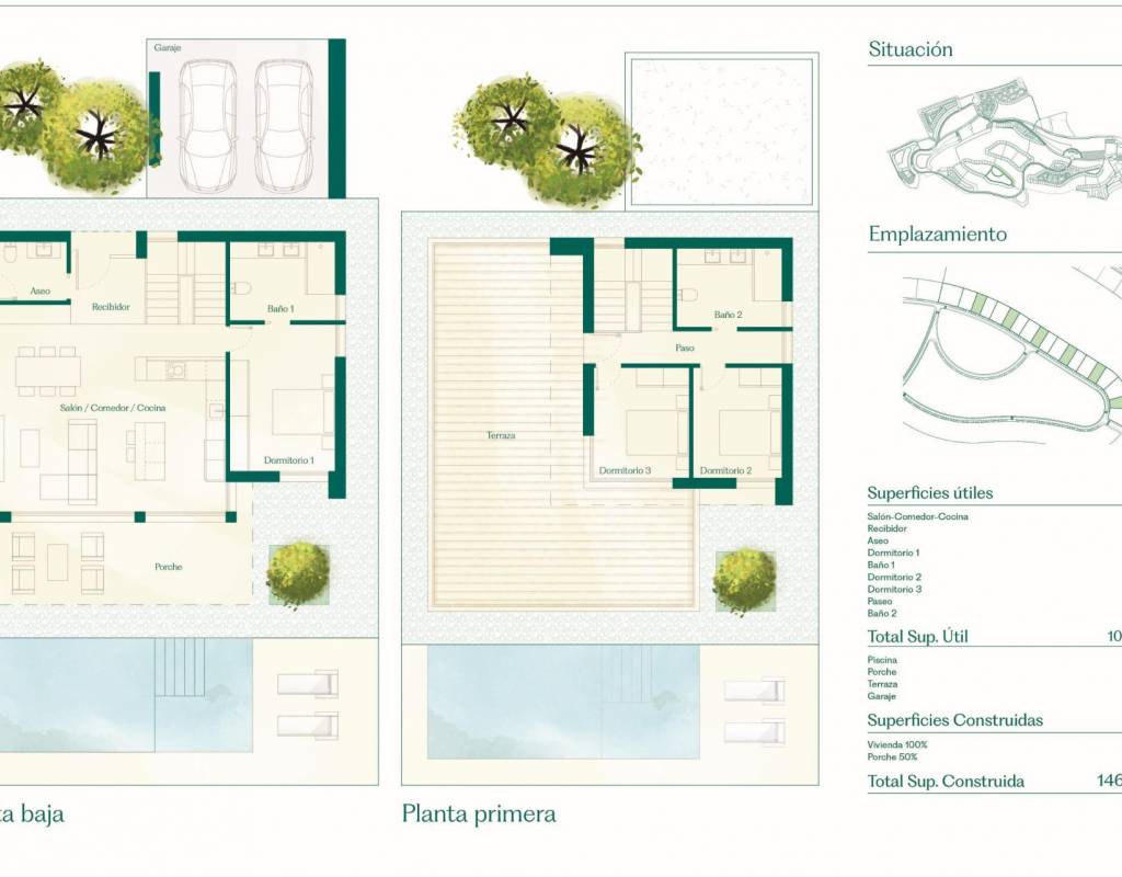 Each property offers a spacious layout with 3 bedrooms, 2 bathrooms, and a guest toilet, across a single or double-level design, depending on the chosen model. With generous plots starting from 700 square meters and a built area of 146 square meters, these homes provide ample space for both indoor and outdoor living.