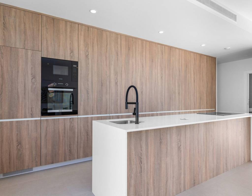 These villas are built with high quality materials and equipped with modern features. The fully fitted kitchens are available in white gloss or wood finish and include quartz worktops, stainless steel sink, induction hob with integrated extractor, oven, microwave, washing machine, integrated fridge and dishwasher. Bathrooms are fitted with furniture, mirrors, lighting and electric towel heaters. Additional features include electric blinds in bedrooms, LED lighting throughout the property and a complete ducted air conditioning system by Fujitsu.
