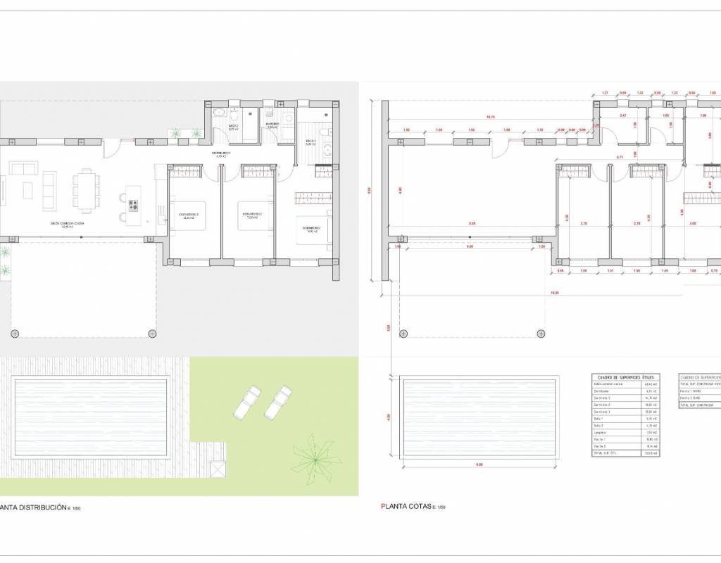 The villa is laid out on one floor and has 3 bedrooms and 2 bathrooms, one of which is en suite.